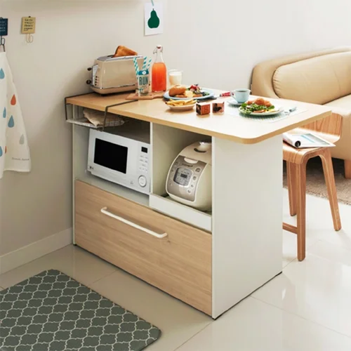 이 제품은 따뜻한 메이플과 화이트 컬러가 조합된 수납형 아일랜드 식탁입니다. 전자레인지와 밥솥 전용 수납함은 물론, 대용량 하부 서랍을 갖춰 주방 공간 효율을 극대화합니다. 모서리를 라운드 처리하여 안전하며, 최대 3~4인까지 넉넉하게 착석할 수 있는 실용적인 조리대 겸 식탁입니다. (의자 미포함)